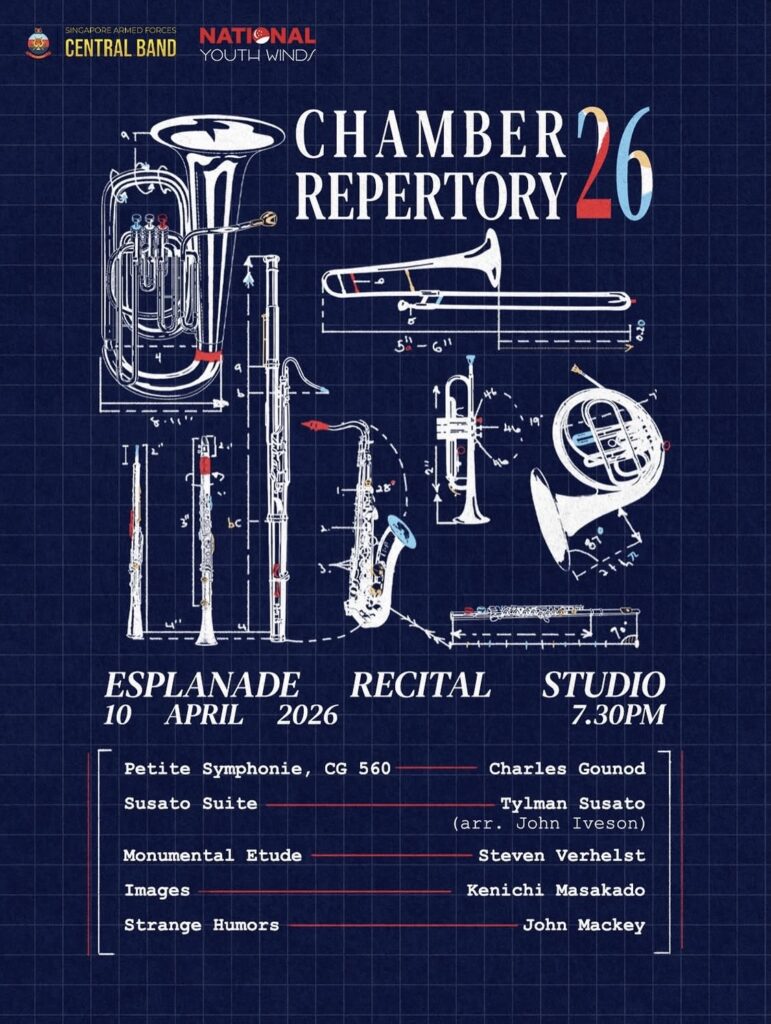4月10日(金)、シンガポール軍セントラルバンド(SAF Band)とナショナル・ユース・バンドによる室内楽コンサート「CHAMBER REPERTORY 26」で拙作『イマージュ 〜サクソフォーン四重奏のために』(2001年作曲/ブレーン・ミュージック刊)が演奏されます。
